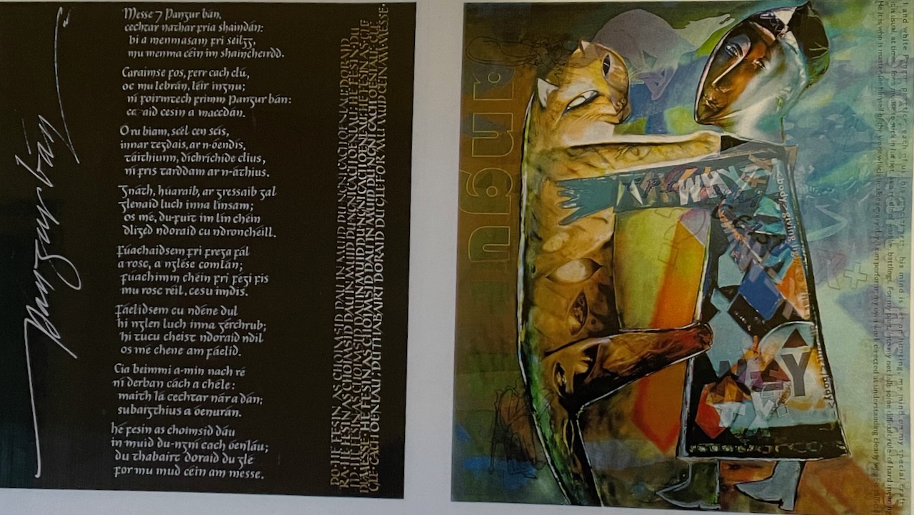 The author is by no means confined to the limited scholarly role he invents for himself. In some sense he is moving towards being both scholar and cat. He refers enigmatically to ‘ar n-óendís’ (lit: our one twosome) and Simon Fraser’s illustration to this poem in An Leabhar Mòr. The Great Book of Gaelic brilliantly captures this oneness, as the two clasp each at respectful distance, with each looking out to the world beyond the painting.